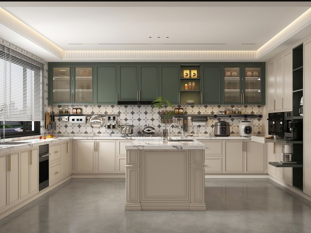 | طرح رنگ | کابینت های نرم کرم با کابینت های سبز عمیق و لهجه |