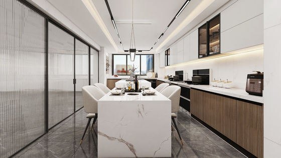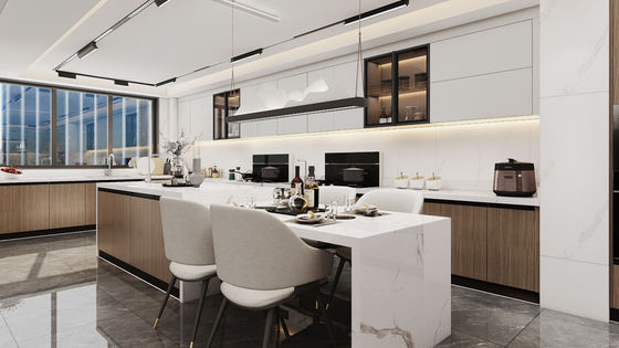 | رنگ | کابینت دارای یک پاک و سفید لاک پایان بر روی درها، تکمیل شده توسط غنی سیاه چوب دانه لهجه. عمیق، خاک مرمر تیره با سقف سفید،که با چراغ های LED در مکان های استراتژیک قرار داده شده است. |