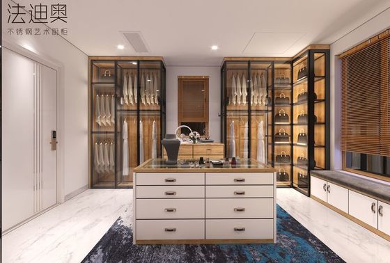 فاديور يک کمد لباس باز لوکس را به نمایش مي گذارد که با لمسه اي از ظرافت مدرن طراحی شده است.و جذابيت معاصر آن را افزایش می دهد.پس زمینه و سقف با دانه های چوبی زرد گرم تزئین شده اند، که لمس ظریف و دقیق طراحی را اضافه می کند. کف آن از سنگ مرمر سفید پاک است.فراهم کردن یک پایه تمیز و کلاسیک. کابینت جزیره، با درب های سفید شفاف، هم شیک و هم کاربردی است، مجهز به کشو و جعبه جواهرات برای راحتی بیشتر.اين کمد لباس به طور کامل زیبایی مدرن را با دوام و پیچیدگی فولاد ضد زنگ ادغام می کند، که باعث می شود آن را یک انتخاب برجسته برای داخلی خانه های ظریف.