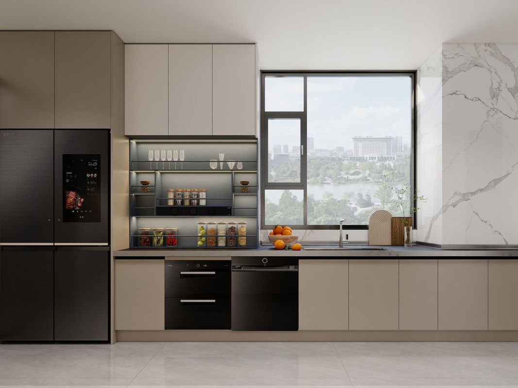 | رنگ و پرداخت | کابینت های بژ و مشکی مات با زیبایی شناسی تصفیه شده و مدرن. |