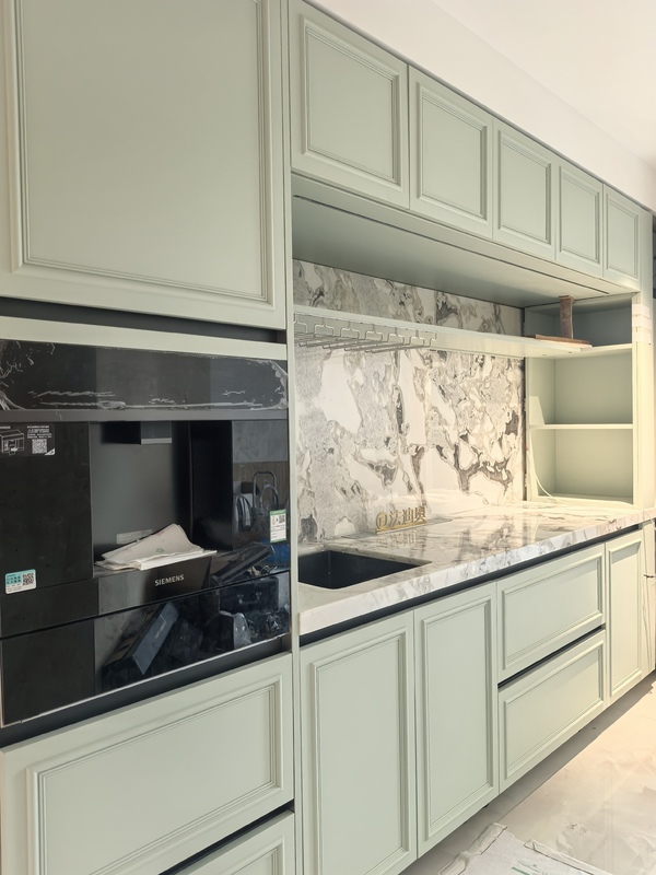 | طرح رنگ | ترکیبی ظریف از کابینتهای سفید روشن و سبز نعنایی ملایم را ارائه میدهد. سفید حس هوا را میآورد؛ سبز نعنایی اضافه میکند |