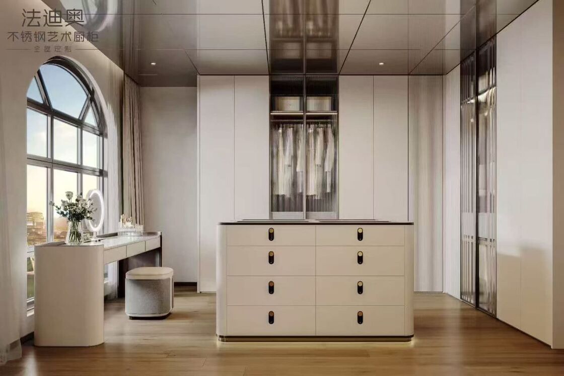 این کمد لباس به عنوان یک سیستم طراحی شده به جای یک SKU عمومی ارائه می شود.از رنگ سفید همراه با ساختار کابینت فولاد ضد زنگ استفاده می کند تا هویت بصری بیشتری را برای پروژه های مسکونی برتر ایجاد کند.