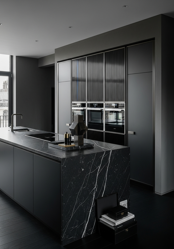 | Material & Performance304 food-grade stainless steel structural system; 6mm dark grey back-painted float glass; matte black lacquer; dark fluted glass (10mm pitch); Nero Marquina natural stone supports moisture resistance, finish stability, and long-term daily use in high-end residential kitchens, designer showrooms, luxury apartment developments, architectural project specifications requiring statement island configurations. That matters when buyers need architectural appearance without wood-based maintenance risk. |
