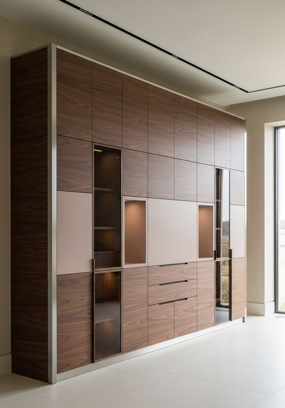 | Core Material | 304 food-grade stainless steel substructure with American walnut wood-grain laminate facing, bronze-tinted smoked float glass modules, matte cashmere-tone lacquer accent panels |